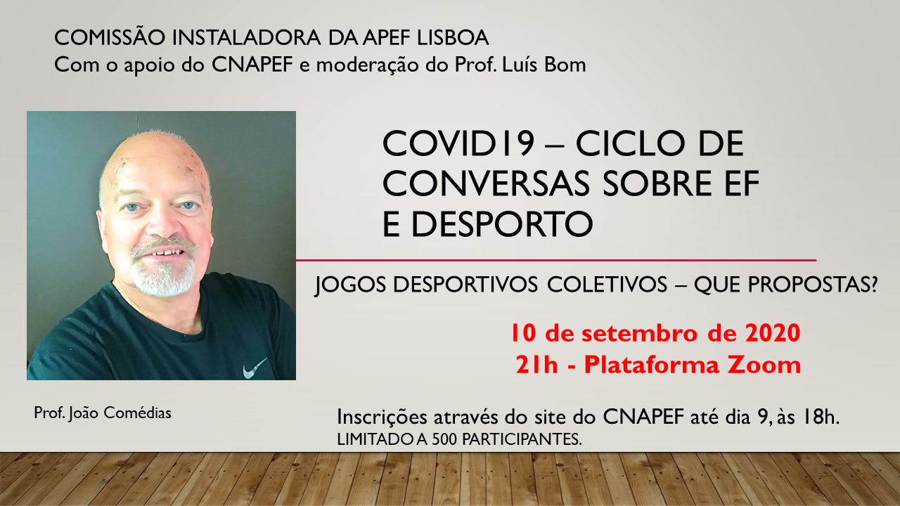 O Professor Doutor João Comédias, é o convidado da 4ª sessão do Ciclo de Conferências sobre Educação Física e Desporto, organizado pela Comissão Instaladora da APEF. O tema é análise dos desafios atuais para a operacionalização dos Jogos Desportivos Coletivos na Educação Física e no Desporto Escolar, tendo em conta as restrições que neste momento existem ao contacto social e à realização de atividades físicas desportivas. O Professor Luís Bom será o moderador desta sessão.